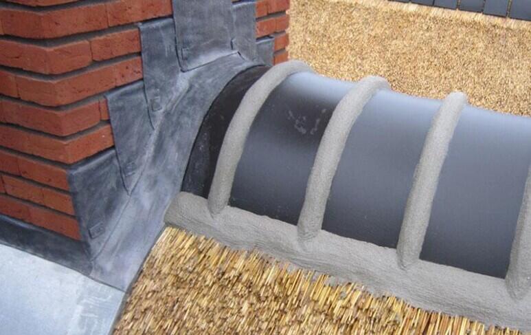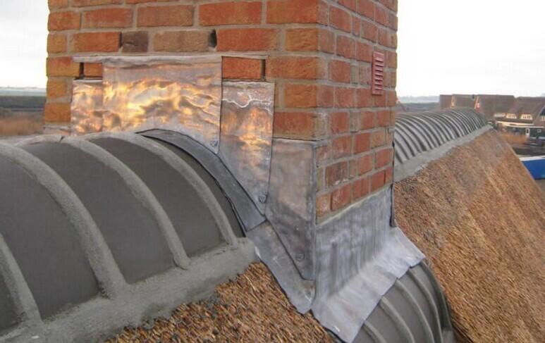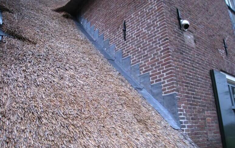 Zink kan wel toegepast worden voor nokken, schoorstenen (beide dus boven het riet) en dakdoorvoeren.